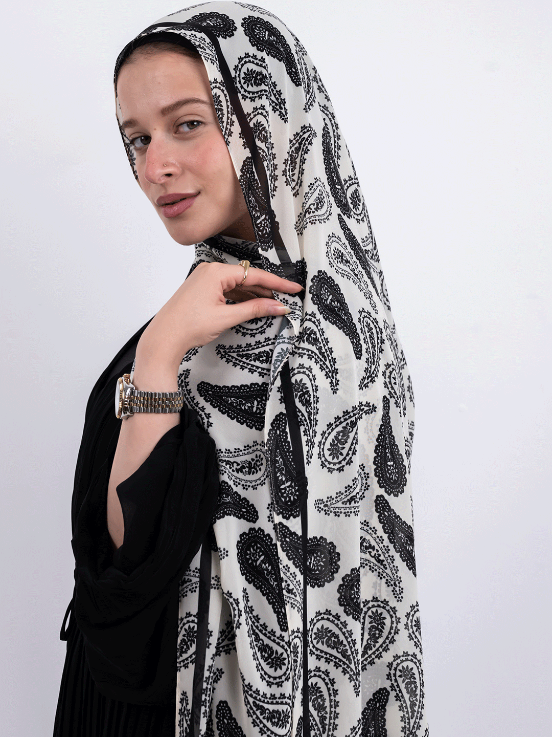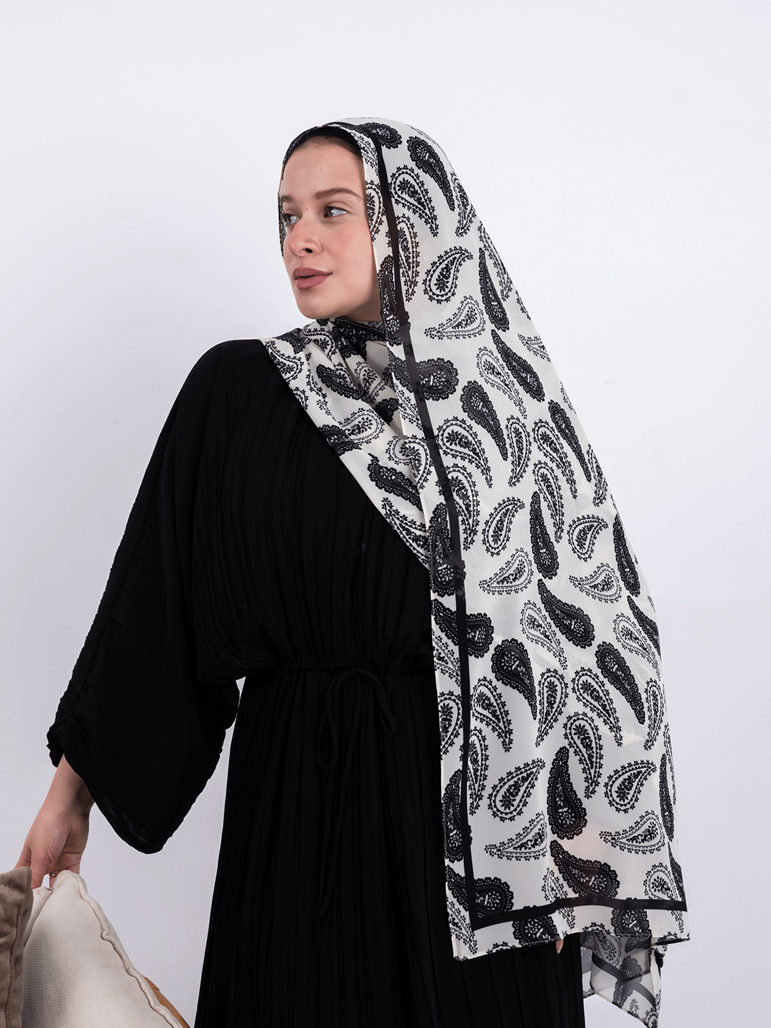 A fluid black paisley pattern unfolds across a soft ivory base, creating a scarf that feels both classic and modern. Lightweight with an easy drape, it adds contrast, movement, and timeless character to everyday looks.