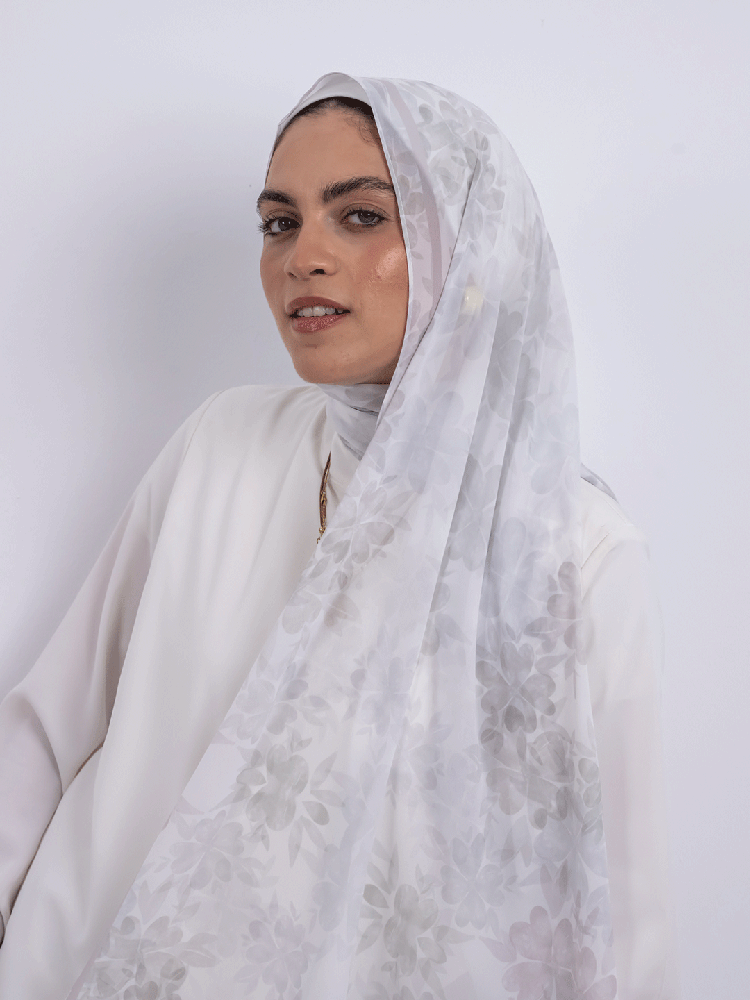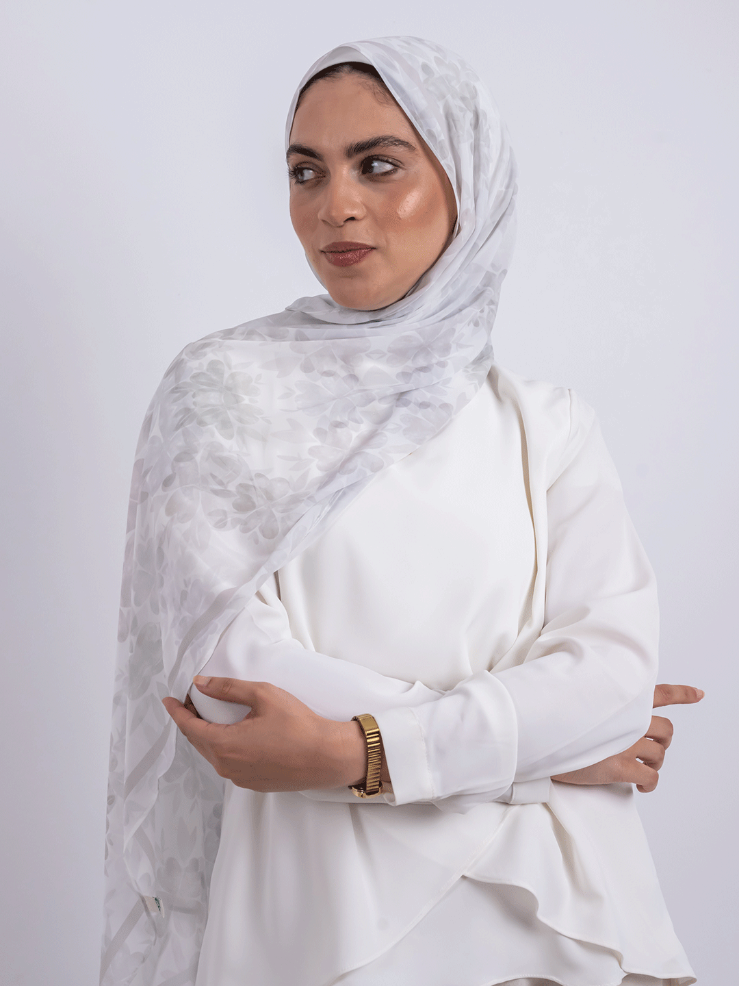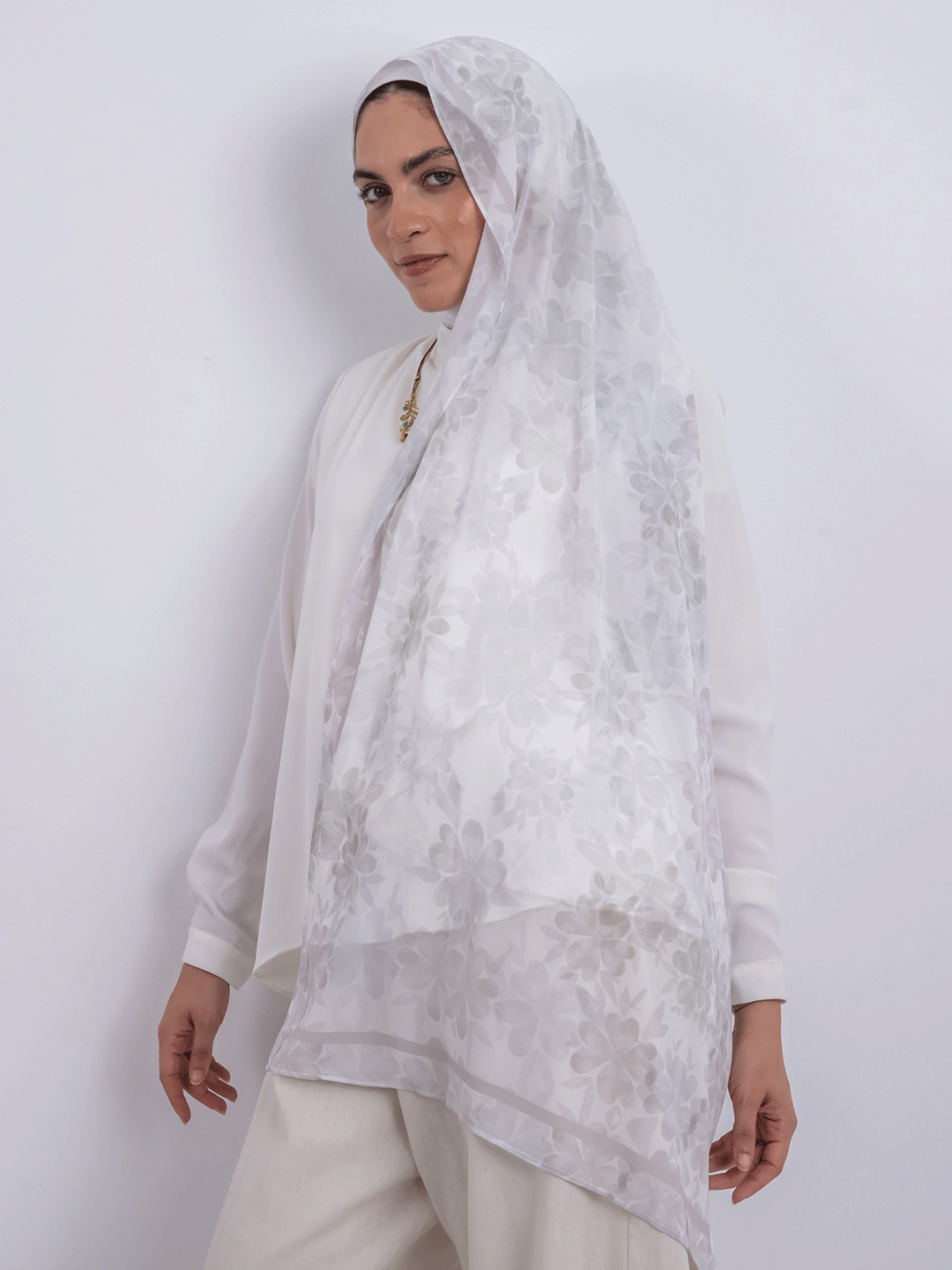 A sheer ivory scarf detailed with soft, tonal floral silhouettes that create a light and airy look. Designed to drape fluidly, it adds a delicate, refined touch to any outfit without overwhelming the overall style.