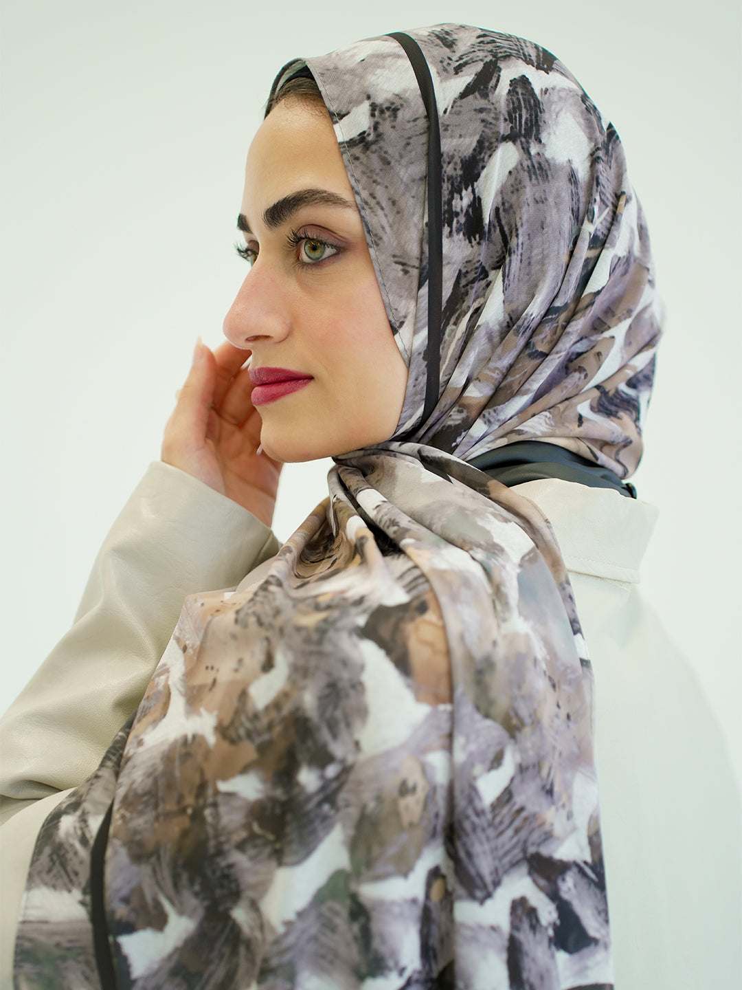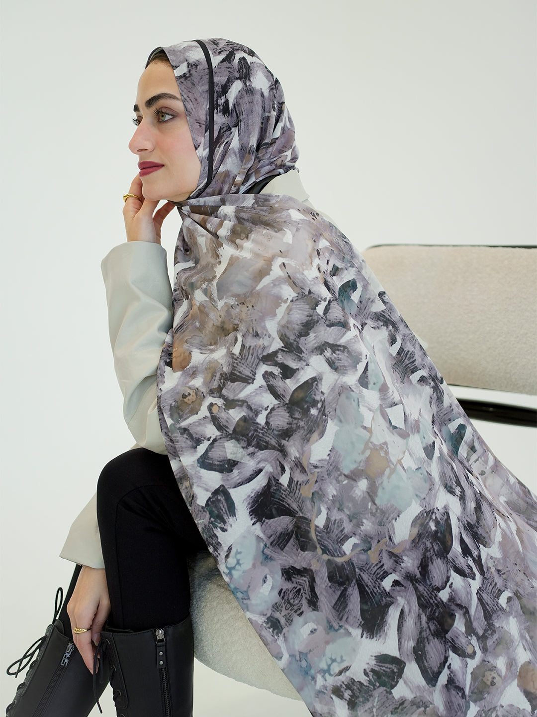 An abstract scarf defined by layered, painterly brushstrokes in cool, muted tones. Lightweight and fluid, it adds depth and a modern artistic touch to everyday styling while remaining soft, balanced, and easy to wear.